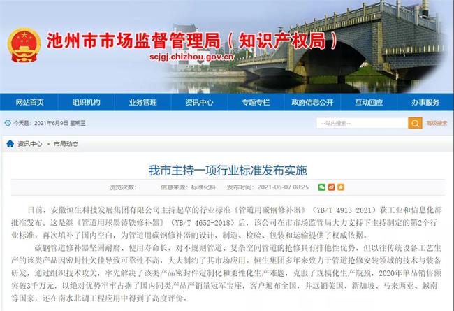 恒生集團(tuán)多年來致力于管道搶修安裝領(lǐng)域的技術(shù)與裝備研發(fā),并已發(fā)展成為集微電子、機(jī)械、化工及彈性體密封件制造等為一體,擁有多家控股子公司的多元化、現(xiàn)代化企業(yè)。恒生集團(tuán)是“安徽省高新技術(shù)企業(yè)”和“國家知識產(chǎn)權(quán)優(yōu)勢企業(yè)”,是多種材料標(biāo)準(zhǔn)的主要起草單位,2015年國家工信部批準(zhǔn)了由恒生集團(tuán)主持起草《管道用球墨鑄鐵修補(bǔ)器》的國家行業(yè)標(biāo)準(zhǔn),該標(biāo)準(zhǔn)將于2018年9月開始實施,這對引導(dǎo)國內(nèi)管道修補(bǔ)器行業(yè)的發(fā)展有著積極而深遠(yuǎn)的意義。